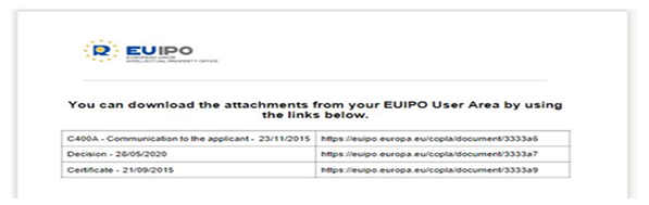 - (배경) 유럽 지식재산청(EUIPO)은 2021년 5월 15일부터 11월 15일까지 6개월간 공식문서에 첨부파일을 링크 주소로 대체하는 프로그램을 시범 운영함1) ∙ 시범 운영 기간 동안에 고객에게 발송되는 우편물에는 첨부파일 출력물 및 첨부파일 링크 목록이 함께 제공되었으며, EUIPO에 사용자계정을 생성하면 링크를 통해 첨부파일을 다운로드 할 수 있게 함 ∙ 6개월간 시범운영의 성과를 점검한 결과 EUIPO는 우편으로 통신을 받은 고객들이 EUIPO의 최첨단 소통수단인 eComm의 혜택 및 사용자계정 등록의 혜택을 누리지 못하고 있는 것으로 파악함 - (주요내용) EUIPO는 ‘취소절차(cancellation proceedings)’에 한정하여 동 시범 서비스를 확대하여 실시하기로 함 ∙ (취소절차) 취소절차에 관련된 통신문의 모든 첨부파일은 링크 주소 목록이 포함된 페이지 형식으로 eComm과 우편으로 발송되며, 목록을 받은 후 15일 이내 사용자계정을 생성하지 않는 경우 EUIPO 정보센터에서 개별 연락을 취하여 계정 생성과 첨부파일 다운로드를 지원함 ∙ (기타 모든 절차) eComm이 발신한 통신문에는 링크 주소만 포함되는 반면, 우편 발송 통신문에는 링크 페이지와 인쇄된 첨부파일이 제공됨 - (향후계획) EUIPO는 ‘취소절차’ 시범 서비스가 성공한다면 다른 영역으로 확장하는 것을 고려하고 있음