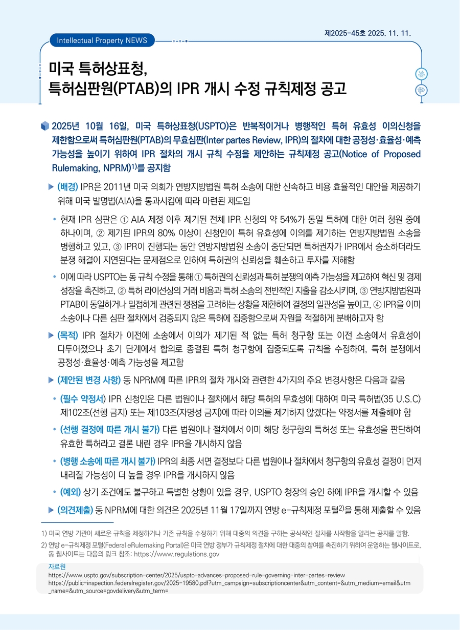 미국 특허상표청, 특허심판원(PTAB)의 IPR 개시 수정 규칙제정 공고