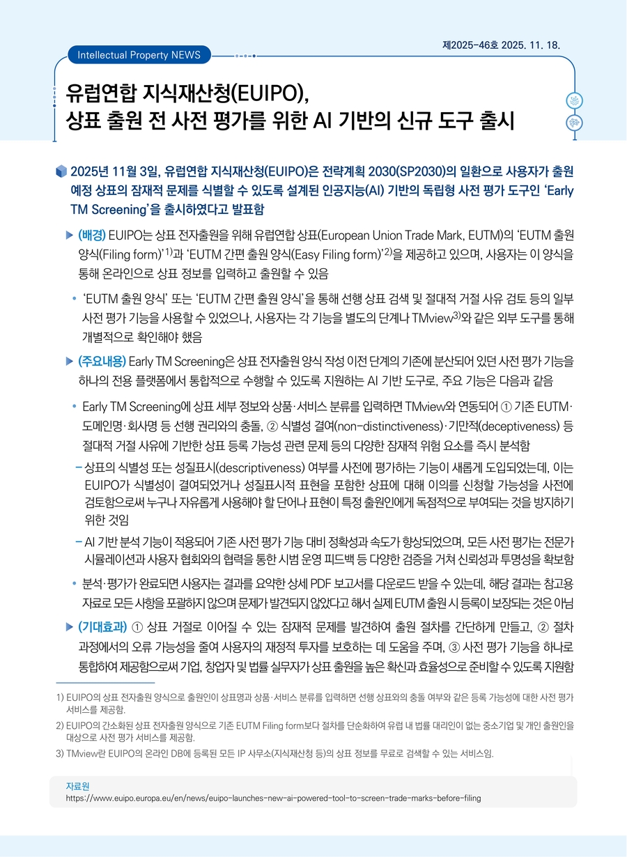 유럽연합 지식재산청(EUIPO), 상표 출원 전 사전 평가를 위한 AI 기반의 신규 도구 출시