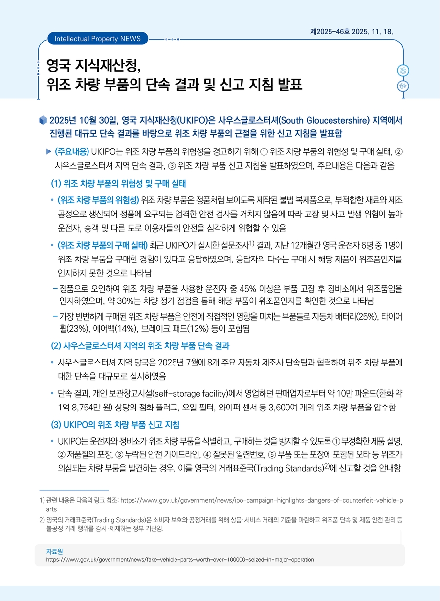 영국 지식재산청, 위조 차량 부품의 단속 결과 및 신고 지침 발표