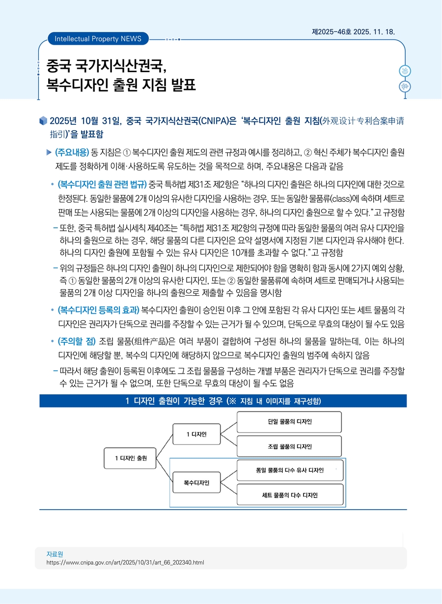 중국 국가지식산권국, 복수디자인 출원 지침 발표