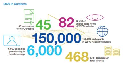 - (개요) 이번 총회는 코로나19 팬데믹에 따른 대표단의 건강과 안전을 고려하여 10월 4일부터 10월 8일까지 온/오프라인 회의로 개최됨 - (주요내용) WIPO의 다렌 탕 사무총장은 지식재산권을 통해 전염병, 기후변화, 지속가능한 개발 등 글로벌 이슈에 대응하고 미래 성장을 위한 기반을 마련해야 한다고 강조하며 2020년 주요 성과를 보고함 · (코로나19 팬데믹 극복 노력) 참가자 600명 이상의 대규모 화상회의 진행 등 기술 및 혁신과 창의력의 활용, 디지털화를 가속화하고 일과 삶의 양식을 변화시킴 · (소통강화) WIPO 트위터 팔로워 15% 증가, WIPO 매거진 구독자수 24% 증가, WIPO 웹사이트 방문자수 40% 증가 등 다양한 방식으로 대중과의 소통을 확대함 · (IP 생태계 형성) 회원국들과의 논의와 협력을 통해 지식재산 관련 국제규범과 표준 형성을 주도하고 WIPO 회원국에게 각종 WIPO 조약에 참여할 것을 독려함으로써 글로벌 지식재산 생태계를 구축함 · (고품질 서비스 제공) 코로나19 팬데믹 위기에도 불구하고 WIPO의 국제 지식재산 시스템(PCT 국제특허, 마드리드 국제상표, 헤이그 국제디자인)이 원활하게 운영될 수 있도록 온라인 수수료 체계 도입 등 디지털화를 가속화하고, 불가피한 사유로 기간이 경과한 권리에 대해 법적 구제 조치를 제공함 · (지속가능한 개발 지원) 개발도상국 역량 강화 활동 등을 통해 직간접적으로 지속가능한 개발을 지원하고, 경제적 잠재력 향상이라는 관점에 초점을 맞추면서 회원국의 혁신과 창조 생태계를 지원함