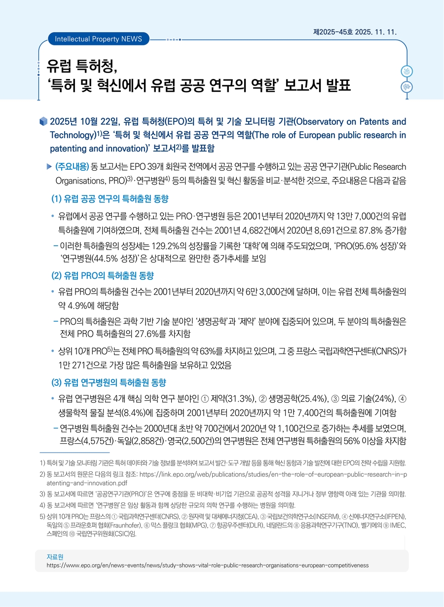유럽 특허청, ‘특허 및 혁신에서 유럽 공공 연구의 역할’ 보고서 발표