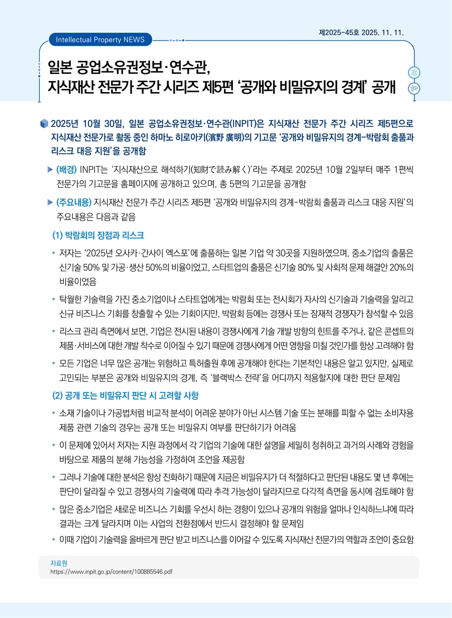 | 일본 공업소유권정보·연수관, 지식재산 전문가 주간 시리즈 제5편 ‘공개와 비밀유지의 경계’ 공개 |