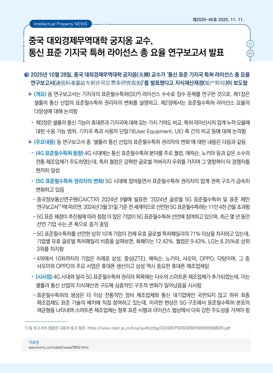 중국 대외경제무역대학 궁지옹 교수, 통신 표준 기지국 특허 라이선스 총 요율 연구보고서 발표