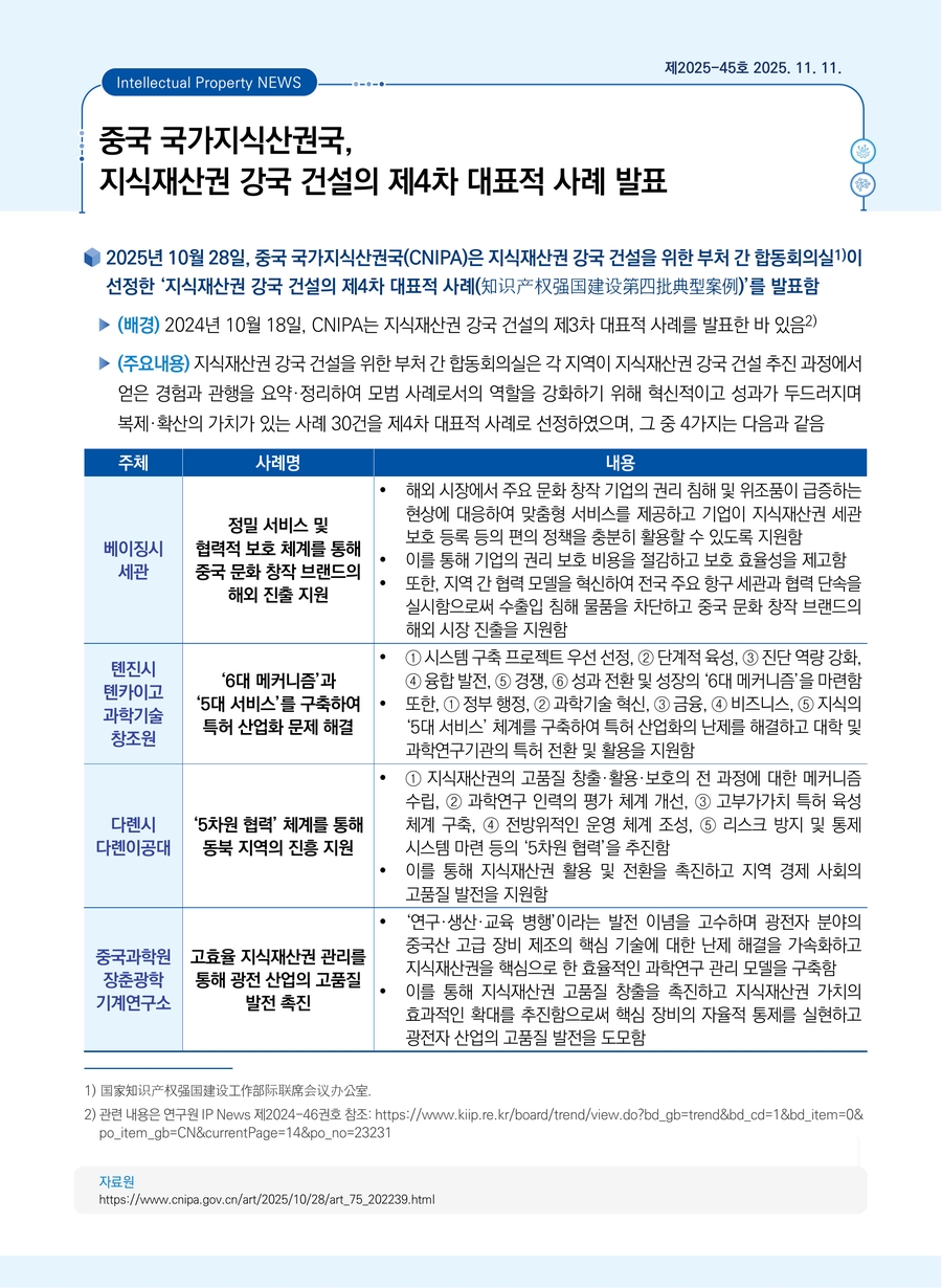 중국 국가지식산권국, 지식재산권 강국 건설의 제4차 대표적 사례 발표