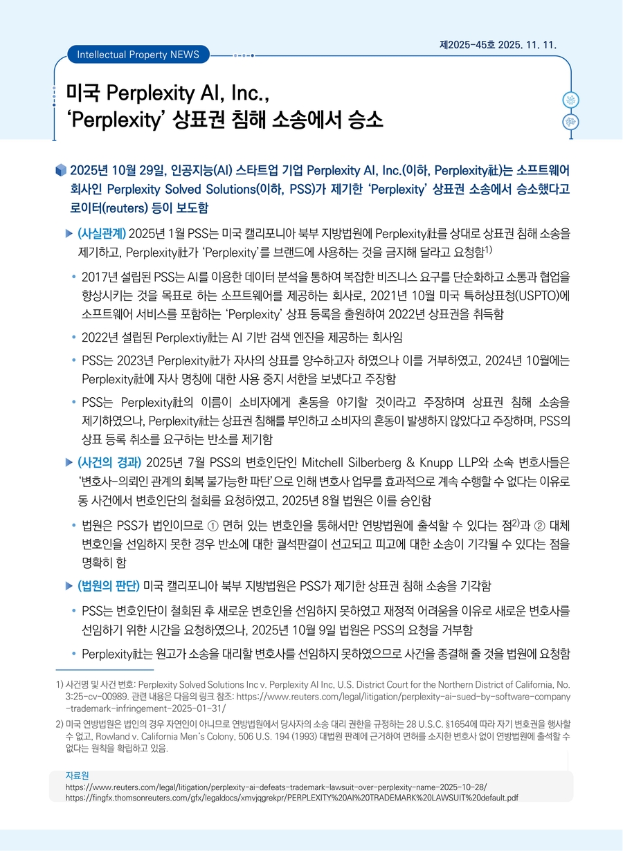 미국 Perplexity AI, Inc., ‘Perplexity’ 상표권 침해 소송에서 승소