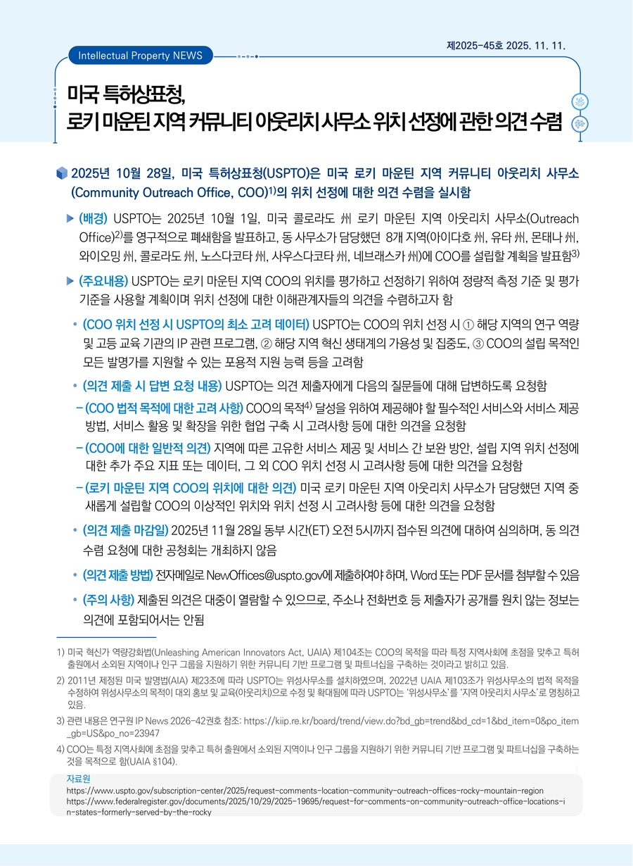 미국 특허상표청, 로키 마운틴 지역 커뮤니티 아웃리치 사무소 위치 선정에 관한 의견 수렴