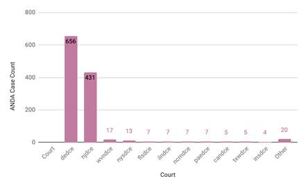 - (주요내용) 동 보고서에 따르면 ANDA 소송은 2018년 정점을 찍은 후 지난 4년간 감소하는 추세가 나타났으며, 그 밖의 주요내용은 다음과 같음 ∙ ANDA 소송은 2018년 약 350건으로 최고치를 기록하였고, 2019년 약 300건으로 크게 감소하였으며 2020년에는 267건으로 소폭 하락하는 한편, 2021년에는 약 102건으로 가장 큰 폭으로 줄어든 것으로 분석되며 이러한 ANDA 소송의 감소 추세는 다른 특허소송 및 특허심판과는 다른 양상을 보임 ∙ 한편 ANDA 사건의 경우, 제네릭 의약품을 시장에 출시하기 위해 ANDA 신청서를 제출하는 것이 침해행위 자체가 되며 제조·사용·판매 등 고전적인 침해행위가 아니라는 점에 유의해야 함 ∙ 미국의 제네릭 의약품 기업의 대다수가 델라웨어 및 뉴저지에 기반을 두고 있는 관계로, 관할권별 소송건수 분포를 살펴보면 델라웨어 및 뉴저지가 전체 ANDA 소송건수의 92%를 차지하며 나머지 다른 16개 주의 다양한 지방법원에 흩어져 있음 ∙ ANDA 사건은 다른 유형의 특허소송에 비해 합의로 끝날 가능성이 낮고, 여러 이유로 기각되는 경우가 많은데 이는 ANDA 소송의 청구인이 다른 특허소송 사건보다 승소할 가능성이 더 높다는 점을 시사함