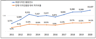 - (개요) 부분디자인제도는 디자인 중 특징적인 요소가 있는 주요 부분에만 권리를 설정할 수 있도록 하는 제도로, 하나의 디자인으로 여러 디자인을 출원하는 효과가 있어 강력한 권리보호 수단으로 평가됨 - (주요내용) KIPO에 따르면, 지난 2001년에 도입한 부분디자인제도에 대한 디자인 출원인의 관심이 높아지고 있으며 구체적인 현황은 다음과 같음 (1) 전체 현황 ∙ 부분디자인 출원건수는 2011년 3,771건에서 2020년 10,107건으로 약 3배 증가하였고, 연평균 11.6%의 증가율을 보였으며, 전체 디자인 출원건수에서 부분디자인 출원건수가 차지하는 비중도 2011년 6.4%에서 2020년 14.1%로 2배 이상 확대됨