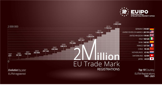 • 2021년 8월 24일, 유럽 지식재산청(EUIPO)은 유럽상표(EUTM) 등록 2만 건을 달성하였다고 발표함