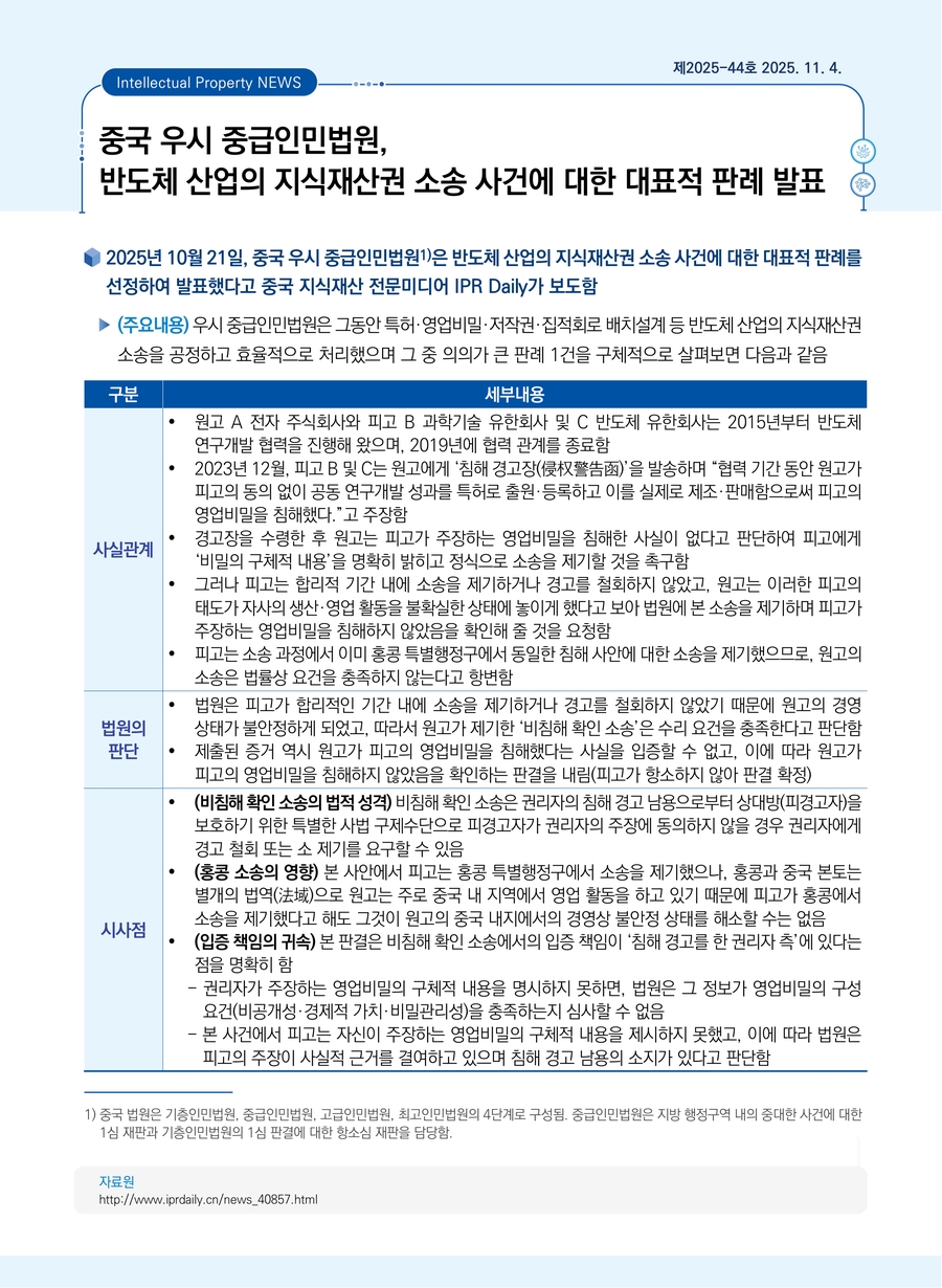 중국 우시 중급인민법원, 반도체 산업의 지식재산권 소송 사건에 대한 대표적 판례 발표
