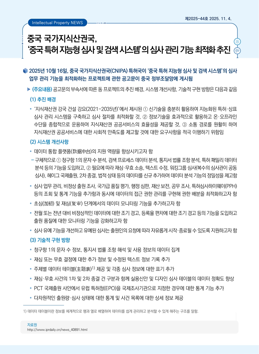 중국 국가지식산권국, ‘중국 특허 지능형 심사 및 검색 시스템’의 심사 관리 기능 최적화 추진