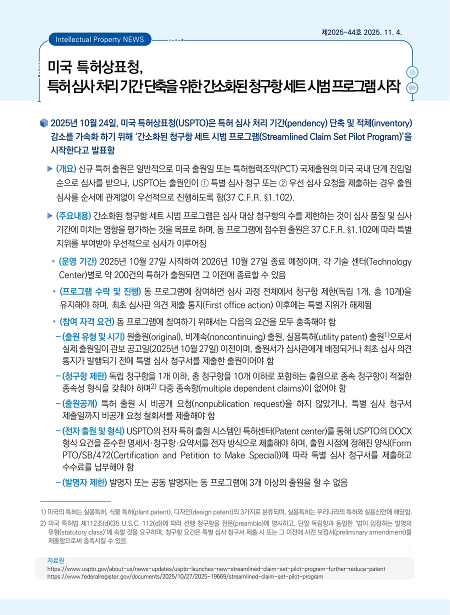 미국 특허상표청, 특허 심사 처리 기간 단축을 위한 간소화된 청구항 세트 시범 프로그램 시작