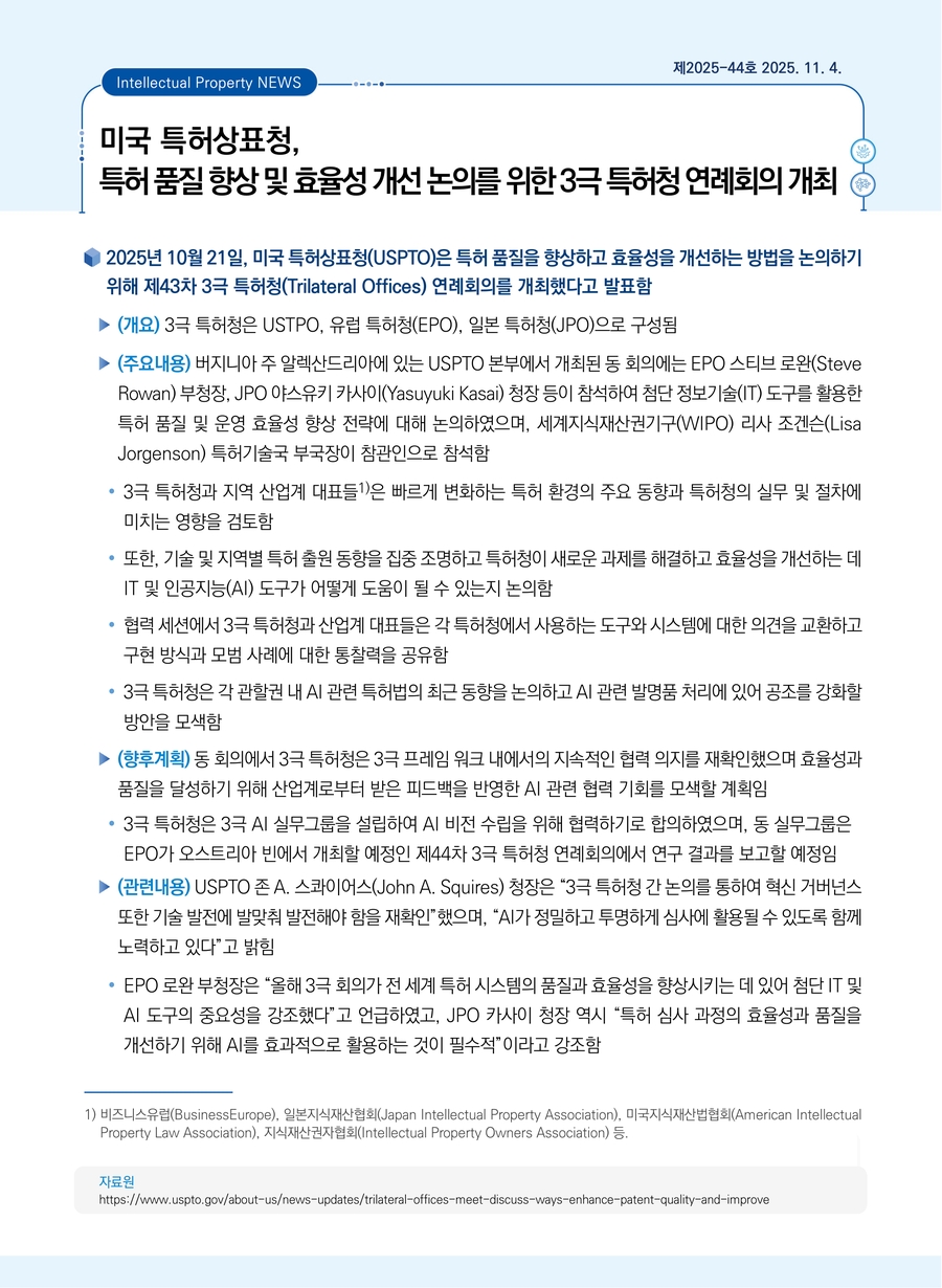 미국 특허상표청, 특허 품질 향상 및 효율성 개선 논의를 위한 3극 특허청 연례회의 개최