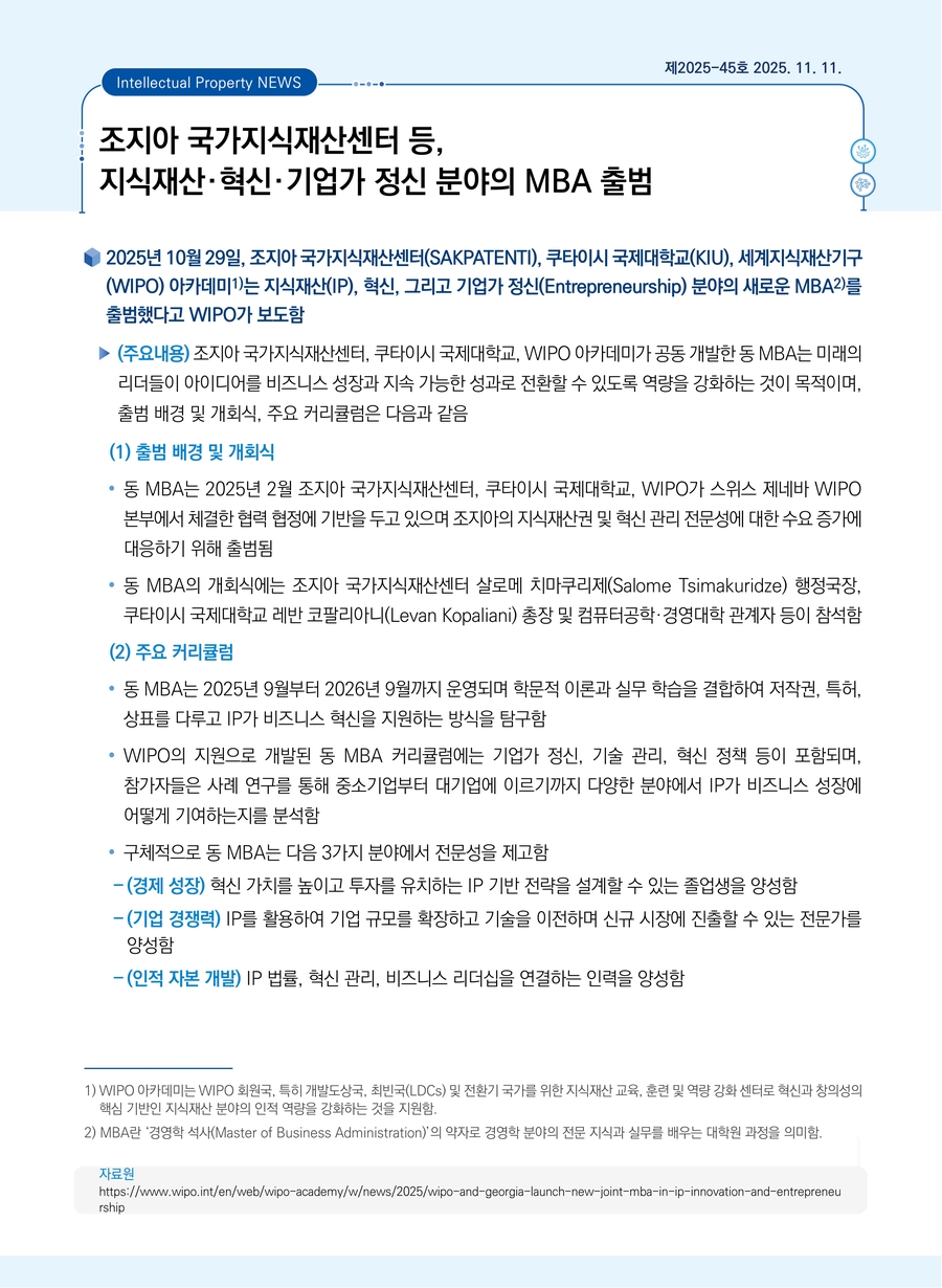 조지아 국가지식재산센터 등, 지식재산·혁신·기업가 정신 분야의 MBA 출범