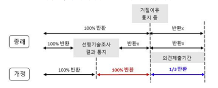 - (주요내용) 동 개정안은 국가적 재난 시 사회적 약자의 수수료 감면, 심사청구료 반환 확대, 수수료 감면 제도의 악용 차단, 직권보정 제도의 보완 등을 주요내용으로 함 (1) 재난 시 수수료 감면(제83조 제2항) · 「재난 및 안전관리 기본법」에 따른 재난사태(제36조) 또는 특별재난지역(제60조)으로 선포된 지역의 출원인을 지원함 · 감면 적용대상(개인, 중소기업 등), 감면 수수료(출원료, 심사청구료, 특허료 등) 등은 ‘특허료 등의 징수규칙(산업통상자원부령 제410호)’에서 구체적으로 규정할 계획임 (2) 심사청구료 반환 확대(제84조) · (개정 전) 심사청구료는 특허청에서 선행기술조사가 되지 않은 상태에서 심사관이 거절이유를 통지하기 전에 특허출원이 취하·포기된 경우에만 반환됨 · (개정 후) 출원인의 출원 취하·포기 시점에 따라 전액 또는 3분의 1에 해당하는 심사청구료가 반환됨