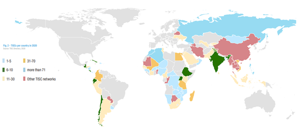 - (개요) WIPO는 2009년부터 기술·혁신지원센터 프로그램을 운영하여 개발도상국 및 최빈국이 지식재산권을 이용해 혁신의 잠재력을 발휘하기 위한 지원을 제공함 ∙ WIPO는 동 프로그램을 통해 지역 혁신가들 간 네트워크를 구축하고 특허 정보, 법률 정보, 과학·기술 문헌, 조사도구에 접근할 수 있도록 도우며, 나아가 기술 이전, 상용화 및 기술 활용을 촉진하고자 함 ∙ 2020년 기준 TISC는 전 세계 80개국에 약 1,100곳이 설립됨 - (주요내용) 코로나19 팬데믹으로 인해 글로벌 디지털 전환이 가속화되는 가운데 TISC 프로그램도 디지털 도구의 개발에 초점을 맞춘 활동을 전개함 ∙ WIPO는 온라인 특허 데이터베이스 모음집인 WIPO Inspire 플랫폼을 구축하여, 정보 이용자가 자신에게 최적화된 특허 검색도구를 선택할 수 있도록 함 ∙ 또한 퍼블릭도메인(public domain) 발명을 식별하고 활용가능하게 하는 실무지침을 마련하여 연구자, 발명가 및 기업가가 자유롭게 이용하도록 함 ∙ 지식재산권 관리 및 기술이전 교육에 관한 방법론과 학습도구를 개발하여 TISC가 속한 국가의 혁신 역량을 강화하는 교육계획 수립을 지원하고자 함