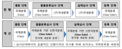 - (배경) 물품분류는 디자인 출원의 대상이 되는 물품을 용도 및 기능, 형태별로 일정한 체계에 따라 분류하여 출원된 디자인과 동일·유사한 선행 디자인을 찾기 위한 제도로 출원 및 심사의 기초가 됨 ∙ 우리나라는 「산업디자인의 국제등록에 관한 헤이그협정」 가입에 따른 국제 디자인 출원제도의 시행으로 2014년 7월 1일부터 로카르노 국제분류를 공식 분류로 채택하여 ‘출원단계’에서 활용하는 반면, 출원된 디자인의 권리부여 여부를 결정하는 ‘심사단계’에서는 검색 효율성이 높은 국내분류를 그대로 사용함 ∙ 이처럼 분류체계를 이원화하여 운영함에 따라 출원단계의 국제분류 물품범위와 심사단계의 국내분류 물품범위가 서로 다른 경우가 있어 출원인이 물품의 유사성을 판단할 때 어려움을 겪는 사례가 발생함 - (주요내용) 특허청은 ‘류(Class)’와 ‘군(Sub-class)’으로 구성된 국제분류 체계를 기반으로 검색 효율성이 우수한 국내분류를 통합한 선진형 신한국분류체계를 개발하여 시행함 ∙ 이를 통해 개인 디자이너 및 기업이 디자인 출원을 준비하는 과정에서 특허청 심사관과 동일한 기준으로 물품의 유사 여부 판단을 할 수 있게 되어 권리확보의 예측 가능성이 높아짐 ∙ 또한, 국제기준에 부합한 물품분류체계 운영으로 헤이그협정에 가입한 주요국들과 2년 주기로 시행되는 로카르노 물품분류 개정작업에 적극적으로 참여할 수 있는 계기가 될 것으로 보임 ∙ 새롭게 시행되는 신한국분류체계는 7월 1일 이후 출원 건부터 심사단계에만 적용되며, 출원단계에서는 현재와 동일하게 국제분류를 활용하면 됨
