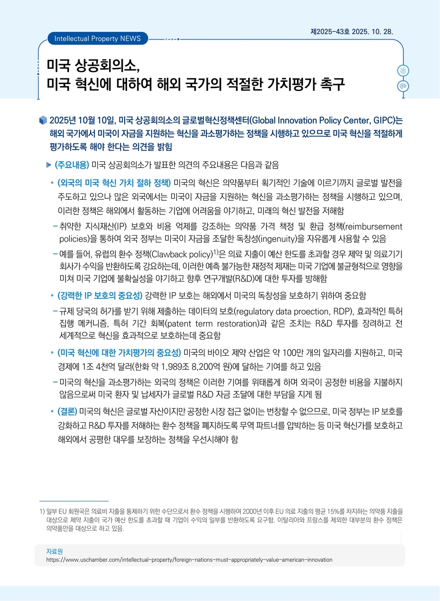 미국 상공회의소, 미국 혁신에 대하여 해외 국가의 적절한 가치평가 촉구