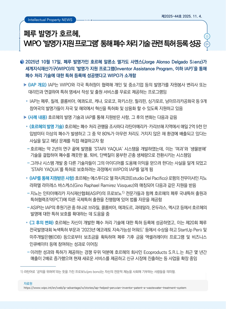 페루 발명가 호르헤, WIPO ‘발명가 지원 프로그램’ 통해 폐수 처리 기술 관련 특허 등록 성공