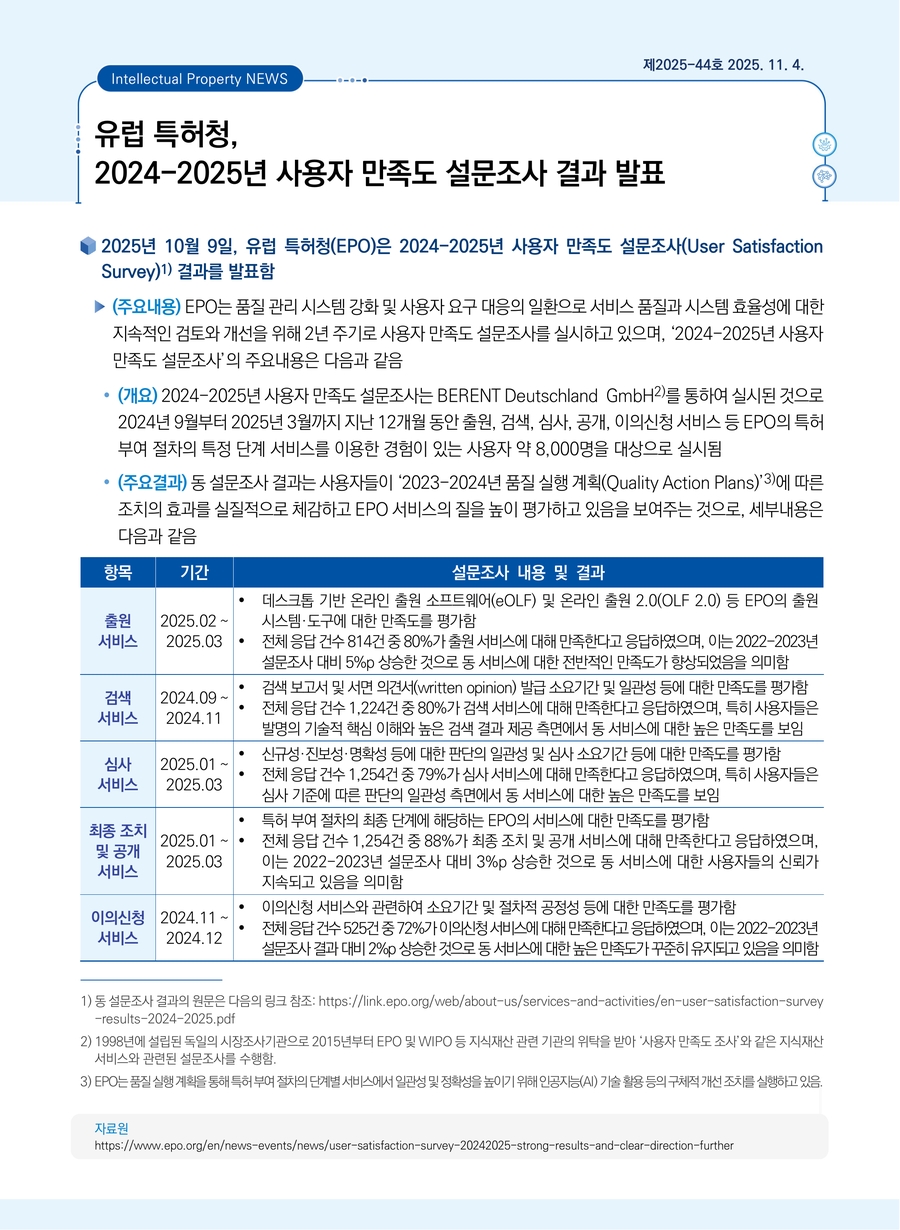 유럽 특허청, 2024-2025년 사용자 만족도 설문조사 결과 발표