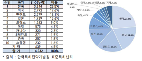 - (개요) 표준특허(SEP: Standard Essential Patent)란 엘티이(LTE), 5세대 통신(5G), WiFi, 블루투스, MP3 등과 같은 표준기술을 사용하는 제품을 생산하고 판매하기 위해서 반드시 사용해야만 하는 특허를 의미함 ∙ 다만, 기업 등이 표준화기구에 표준특허라고 선언하는 것만으로 표준특허가 되는 것은 아니고, 선언 표준특허가 표준특허풀 가입이나 특허소송 등의 과정에서 표준규격과의 정합성 여부를 판단하는 표준특허 필수성 검증을 통해 표준규격과 일치하는 것으로 확인되어야 실제 표준특허로 인정받음 - (주요내용) 2020년 한국은 2016년 519건(세계 5위) 대비 약 6.4배 증가한 3,344건(23.5%)으로 세계 1위에 올랐으며, 이어 미국이 2,793건(19.6%)으로 2위를 차지했고, 핀란드가 2,579건(18.1%)으로 3위, 일본이 1,939건(13.6%)으로 4위, 프랑스가 1,283건(9.0%)으로 5위에 오름 ∙ 3대 국제표준화기구에 신고한 선언 표준특허를 보유한 기관별로는 삼성전자(한국)가 2,799건으로 1위를 차지했고, 이어 노키아(핀란드)가 2,559건으로 2위, 톰슨라이센싱(프랑스)이 907건으로 3위, 애플(미국)이 350건으로 4위에 올랐으며, 한국전자통신연구원(한국)은 251건으로 5위에 오름 ∙ 2020년에 3대 국제표준화기구에 신고한 선언 표준특허가 급격하게 증가한 이유는 2020년 하반기 삼성전자가 ISO/IEC JTC1에 영상코덱 관련 특허 약 2,500건을 집중적으로 선언하였기 때문임 ∙ 그동안 정부는 과학기술정보통신부의 ‘정보통신·방송 표준개발지원사업’, 산업통상자원부(국가기술표준원)의 ‘국가표준기술력향상사업’, KIPO의 ‘표준특허 창출지원 사업’ 상호 연계를 통해 표준특허 전문기관을 육성하는 등 R&D-표준-특허 연계를 통한 표준특허 경쟁력 확보를 위해 노력해옴