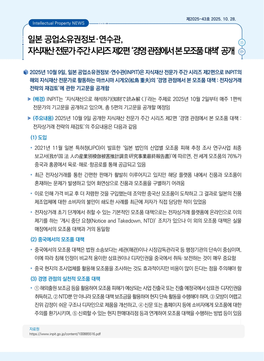 일본 공업소유권정보·연수관, 지식재산 전문가 주간 시리즈 제2편 ‘경영 관점에서 본 모조품 대책’ 공개