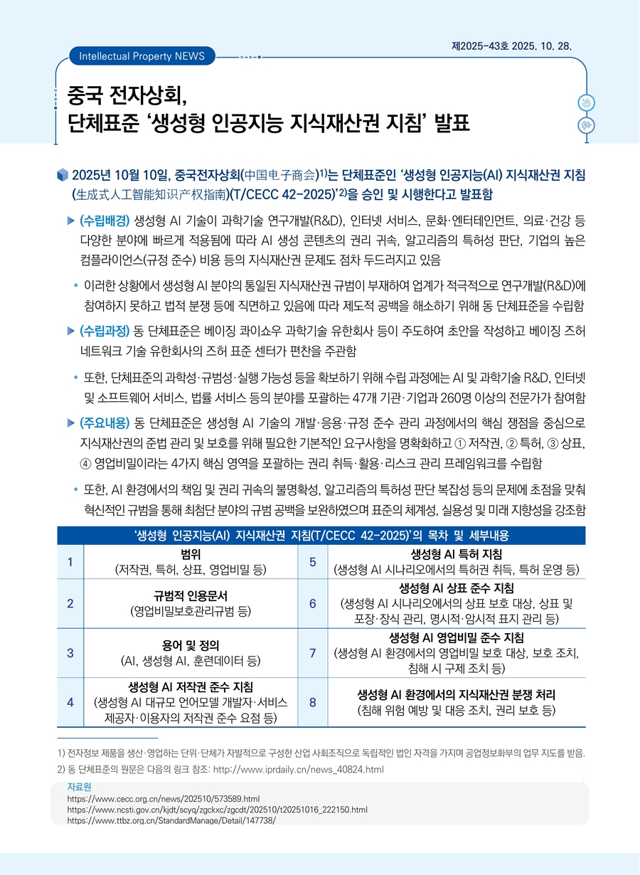 중국 전자상회, 단체표준 ‘생성형 인공지능 지식재산권 지침’ 발표