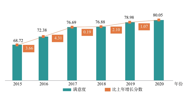 - (개요) CNIPA는 9년 연속 전국적으로 지식재산권 보호 사회만족도 조사를 실시하고 있으며, 관련 평가 지표에는 법·정책 보호, 법 집행, 관리·서비스, 홍보·교육 등이 포함됨 - (주요내용) 조사결과, 2020년 전국 지식재산권 보호 사회만족도는 80.05점으로 2019년보다 1.07점 높은 역대 최고치를 기록하며 지식재산권 보호 업무의 성과를 객관적으로 인정받음 (1) 법·정책 보호 만족도 ∙ 82.77점으로 항목별 지표 평가에서 가장 높은 점수를 기록했고, 응답자의 96.94%는 지식재산권 법제도 체계가 더욱 완비되었다고 답함 (2) 법 집행 만족도 ∙ 2019년보다 1.60점 오른 78.93점으로 상승폭이 가장 컸고, 응답자의 85.46%가 지식재산권 침해 현상이 개선되었다고 답함 (3) 관리·서비스 만족도 ∙ 처음으로 80점을 넘어 80.22점을 기록했으며, 응답자의 94.11%는 각 지역 정부가 지식재산권 보호 업무를 중요시하는 수준이 크게 높아졌다고 답함 (4) 홍보·교육 만족도 ∙ 2019년보다 0.44점 오른 77.81점으로, 응답자의 90.18%가 지식재산권 보호에 대한 사회적 홍보 역량이 현저히 강화되었다고 답함