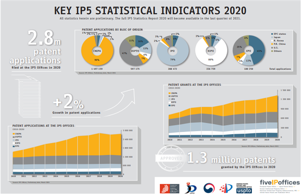 • 2021년 4월 19일, 선진 5개국 특허청(IP5)은 ‘2020년 IP5 예비 통계 지표(Key IP5 Statistical Indicators 2020)’를 인포그래픽 형식으로 발표함