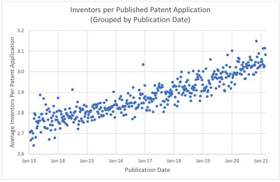 ● 2021년 3월 11일, 미국 특허전문 블로그 Patently-O는 2013년 1월부터 2021년 1월까지 미국 내 특허출원 당 발명가 인원수에 대한 추이를 분석하여 보도함