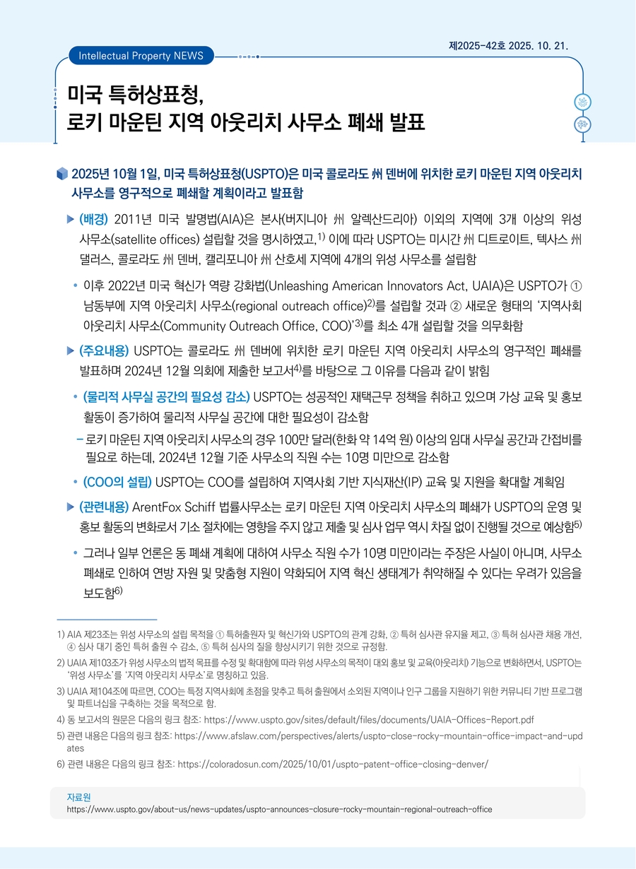미국 특허상표청, 로키 마운틴 지역 아웃리치 사무소 폐쇄 발표