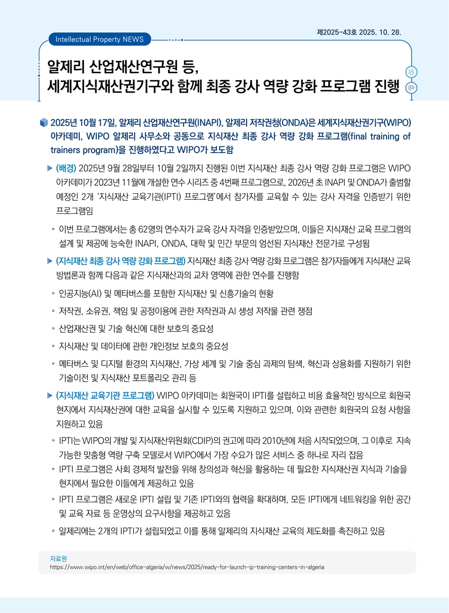 알제리 산업재산연구원 등, 세계지식재산권기구와 함께 최종 강사 역량 강화 프로그램 진행