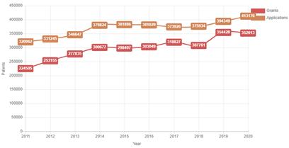 - (개요) IFI Claims社는 2011년부터 동 조사를 실시하였으며, 미국 특허상표청(USPTO)의 자료를 활용하여 특허현황을 분석함 - (주요내용) 동 조사는 미국의 특허 출원 및 등록, 출원 국가, 출원 기술 분야 등을 활용하여 실시되었으며 조사 결과에 따르면 2020년 미국에서 취득된 등록 특허는 352,013건으로 전년 대비 0.68% 감소함 ∙ 2020년 미국 특허 출원 건수는 413,176건으로 전년도 394,349건과 비교하여 크게 증가한 반면 등록 건수는 소폭 감소하여 코로나19에 의한 큰 영향은 없었던 것으로 확인됨