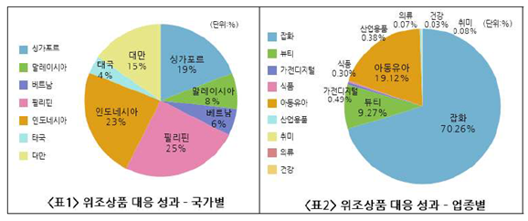 - (배경) 모니터링단은 아세안 6개국1) 및 대만을 대상으로 위조상품 유통대응을 강화하고 비대면·디지털 일자리 창출에 기여하기 위해 출범되었음 ∙ 이들은 아세안 온라인 쇼핑몰 1,2위 업체인 라자다(Lazada)와 쇼피(Shopee)를 대상으로 위조상품 게시물을 모니터링 함 - (주요내용) 국가별로는 필리핀, 인도네시아, 싱가포르, 대만 등의 순으로 위조상품 적발 및 차단 건수가 많은 것으로 나타남 ∙ 품목별로는 K-POP 굿즈, 패션잡화 등이 전체의 70%를 차지했고, 아동유아 분야가 19.12%, 뷰티 분야가 9.27%, 가전디지털 분야가 0.49% 등으로 나타났음