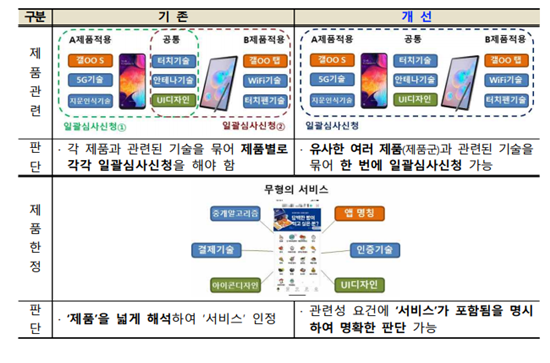 - (배경) 기존의 일괄심사제도는 ‘하나의 제품’과 관련된 지식재산권 신청으로 대상 요건이 제한되어 기업의 이용에 한계가 있었고, 일괄심사 신청요건에 부합하는지를 증명해야 하는 절차에 부담이 발생함 ∙ 그럼에도 불구하고 일괄심사신청에서 심사착수까지 평균 1.8개월이 소요되어 처리기간이 짧고, 심사에 착수하면 바로 등록결정되는 비율이 높아 비교적 빠른 권리획득이 가능한 장점이 있음 - (주요내용) 개선된 일괄심사제도는 기존 제도의 장점에 더하여 ‘서비스를 포함하는 하나의 제품군 등’으로 대상을 확대하고, 서면으로 일괄심사 대상임을 설명할 수 있도록 절차를 개선함 ∙ 또한 사업화 등을 위해 권리 획득이 필요한 스타트업1)(창업 후 3년 이내의 중소기업)에게 일괄심사를 이용할 수 있도록 요건을 완화함