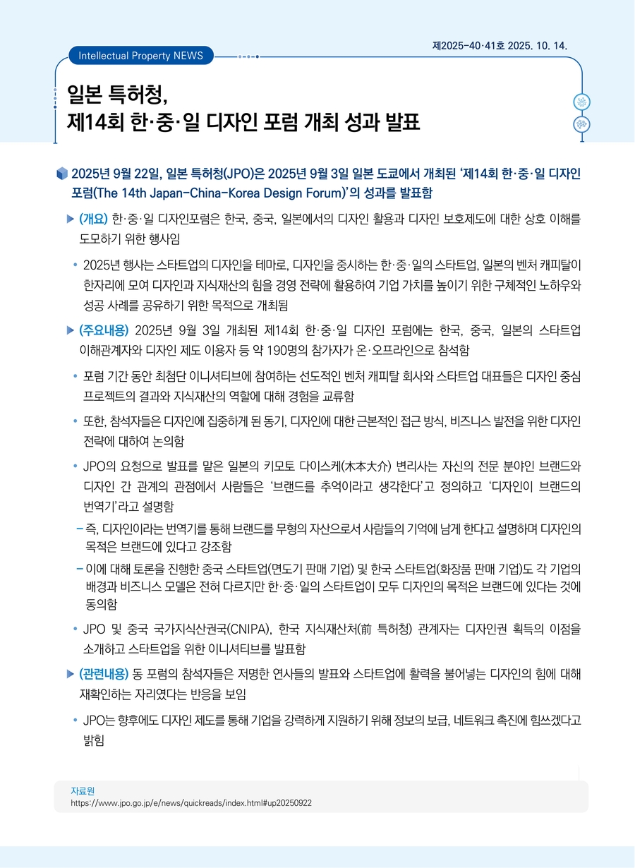 일본 특허청, 제14회 한·중·일 디자인 포럼 개최 성과 발표