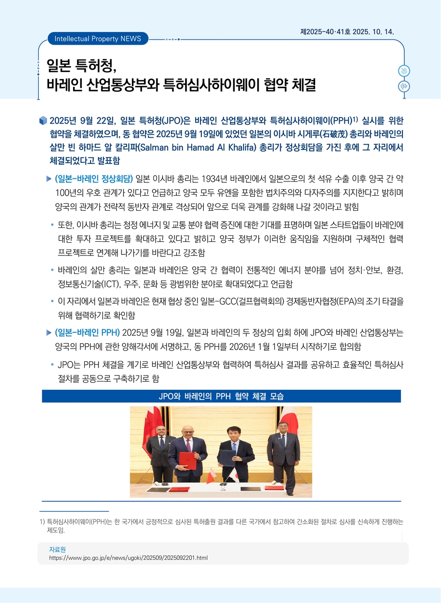 일본 특허청, 바레인 산업통상부와 특허심사하이웨이 협약 체결