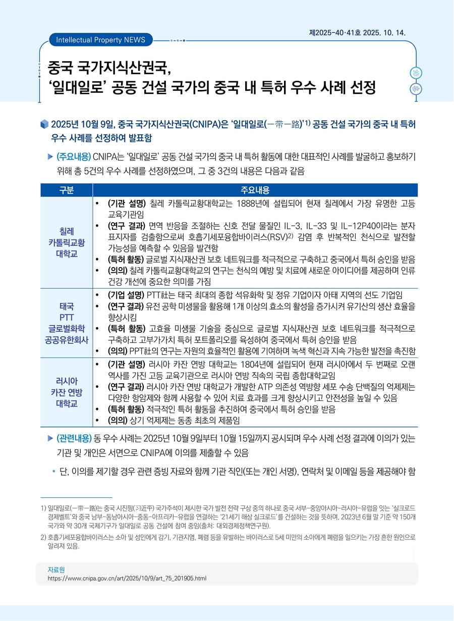중국 국가지식산권국, ‘일대일로’ 공동 건설 국가의 중국 내 특허 우수 사례 선정