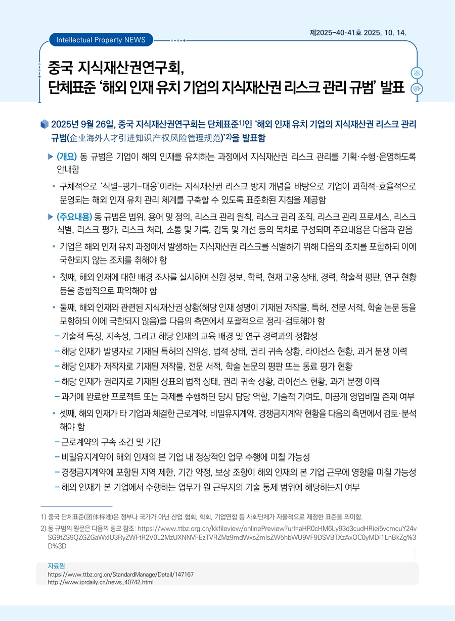 중국 지식재산권연구회, 단체표준 ‘해외 인재 유치 기업의 지식재산권 리스크 관리 규범’ 발표