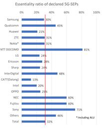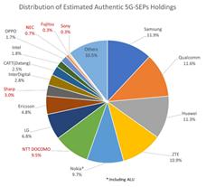 ● 2020년 10월 12일, ICT 관련 기술조사 등을 실시하는 기업 사이버창연(サイバー創研)社는 정보통신분야 기업이 5G 표준필수특허로 표준화 단체에 선언한 특허(5G-SEP)에 대해 5G 표준 규격과의 정합성을 실제로 평가하여 실제 5G 표준필수 특허의 보유 현황을 추정한 결과를 발표함