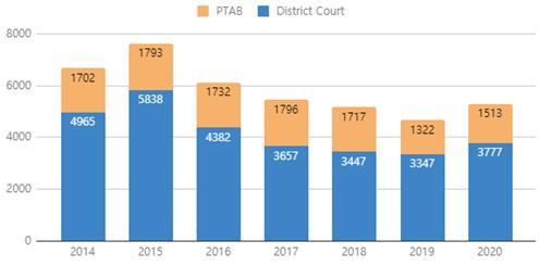 - (배경) Unified Patent社는 매년 분기별 지방법원(District Court) 및 특허심판원(PTAB)에서 제기된 특허소송 및 심판을 파악하여 특허분쟁 동향을 발표함 - (주요내용) 특허분쟁은 코로나19의 영향을 받지 않은 것으로 보이는 분야 중 하나로 지난 몇 년보다 최근 더 높은 수치를 기록하고 있는 가운데 2020년 3분기 특허분쟁 건수는 전년도 분기 대비 13.7% 감소하였으나 이러한 수치가 계속된다고 가정하면 2020년도 전체 소송건수는 2017년 이후 최고 수준에 이를 것으로 예상함 ∙ 특허심판(PTAB) 신청의 경우 전 분기 대비 16.1% 증가하여 2018년 4분기 이후 최고치를 기록하였으며, 심판절차 및 소송이 결합된 특허분쟁은 2019년 대비 12.7% 증가한 것으로 추정됨 ∙ 텍사스 서부 지방법원은 NPE에게 가장 인기가 많은 법원으로 2020년 3분기 기준 총 512건의 특허소송이 제기되어 서부 지방법원 전체 소제기 건수의 86%를 차지함 ∙ 새롭게 제기되는 특허소송의 65%, 특허심판의 경우 약 63%가 첨단기술 산업과 관련이 있음