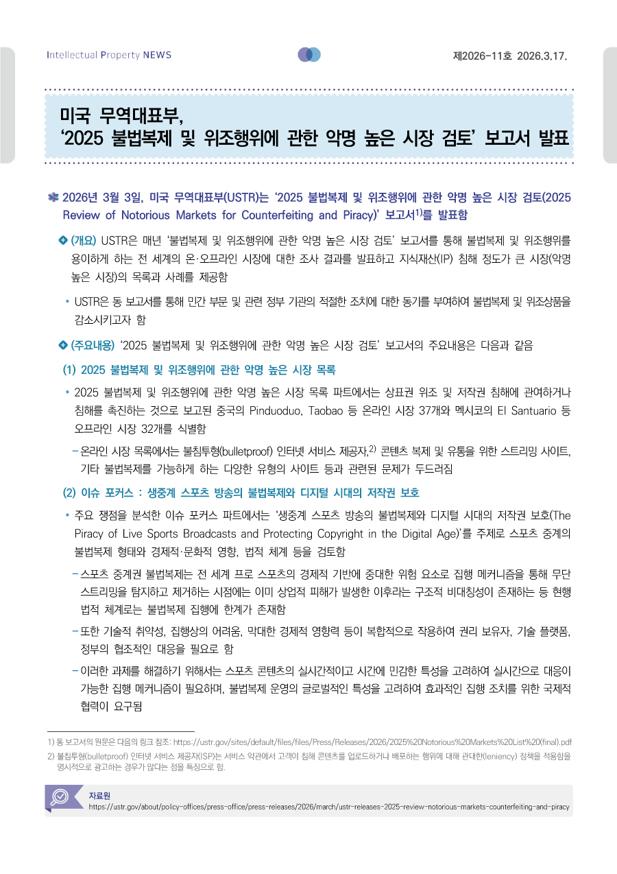 미국 무역대표부, ‘2025 불법복제 및 위조행위에 관한 악명 높은 시장 검토’ 보고서 발표