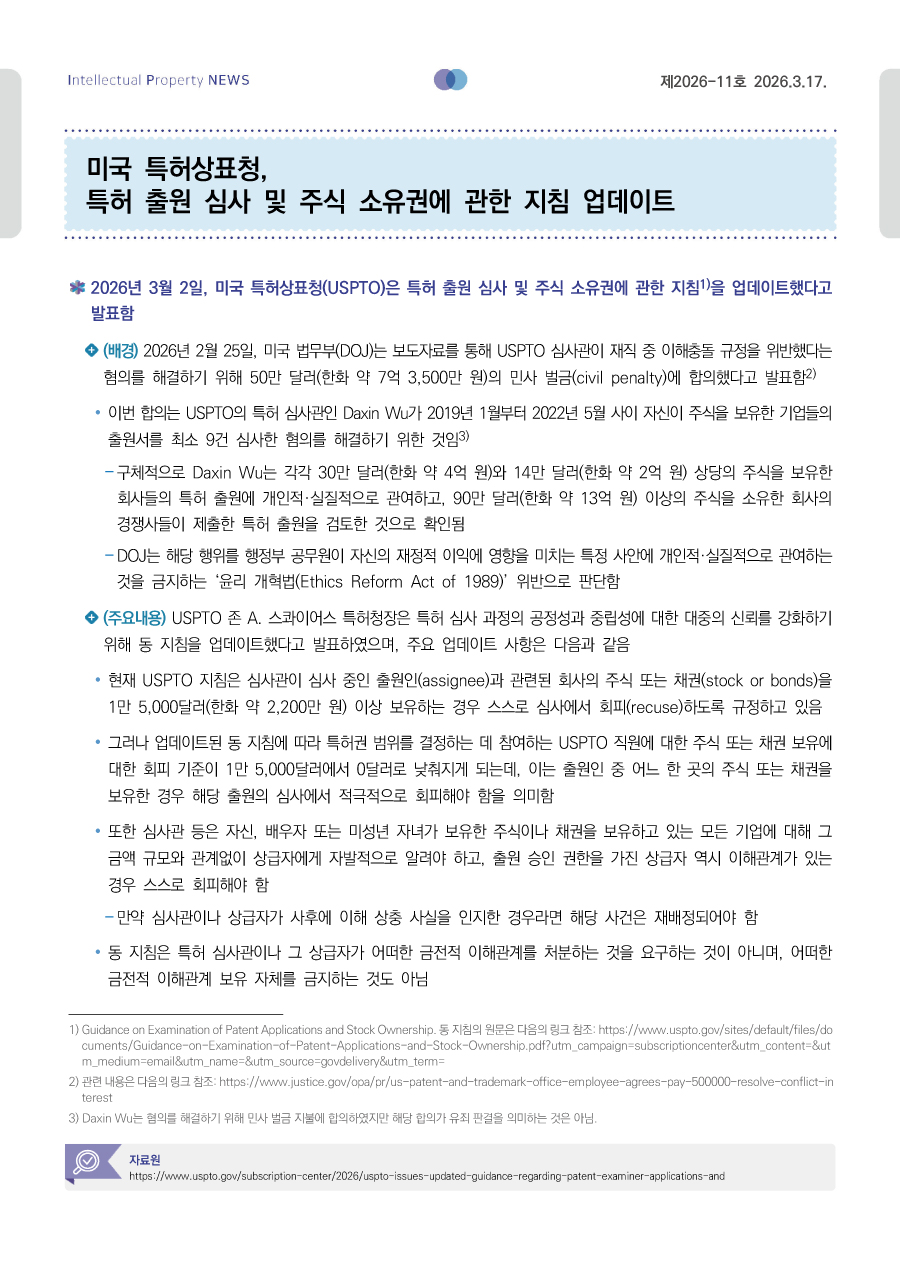 미국 특허상표청, 특허 출원 심사 및 주식 소유권에 관한 지침 업데이트