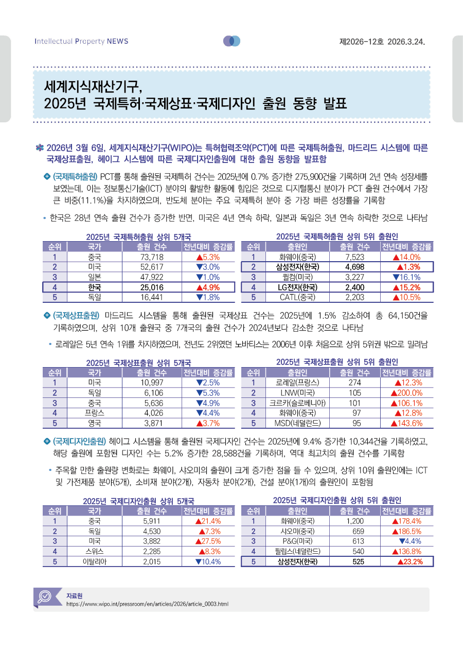 세계지식재산기구, 2025년 국제특허·국제상표·국제디자인 출원 동향 발표