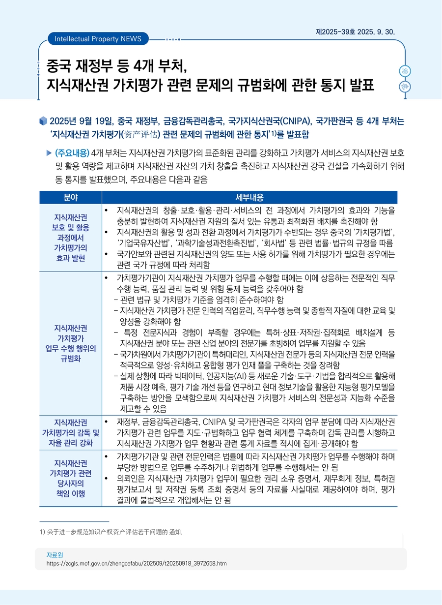 중국 재정부 등 4개 부처, 지식재산권 가치평가 관련 문제의 규범화에 관한 통지 발표