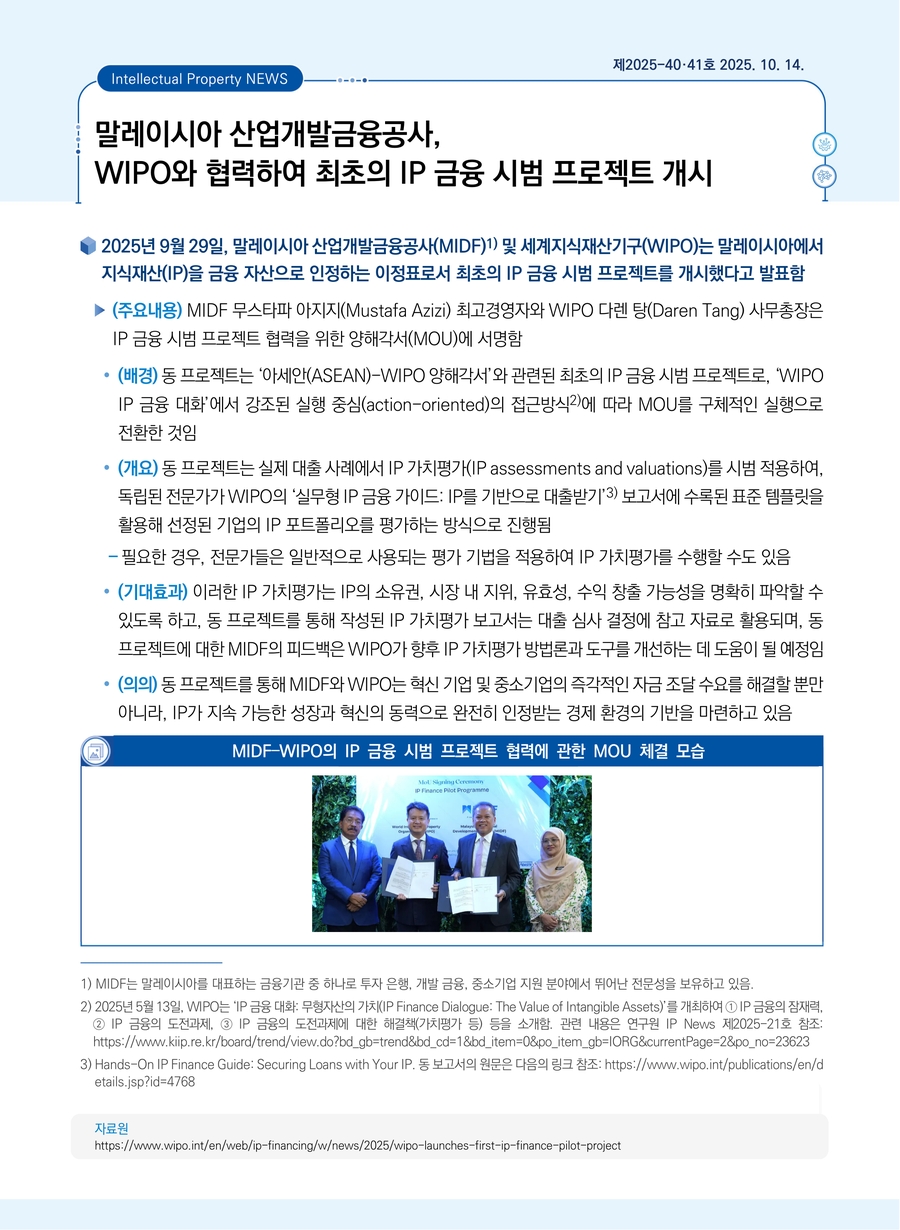 말레이시아 산업개발금융공사, WIPO와 협력하여 최초의 IP 금융 시범 프로젝트 개시