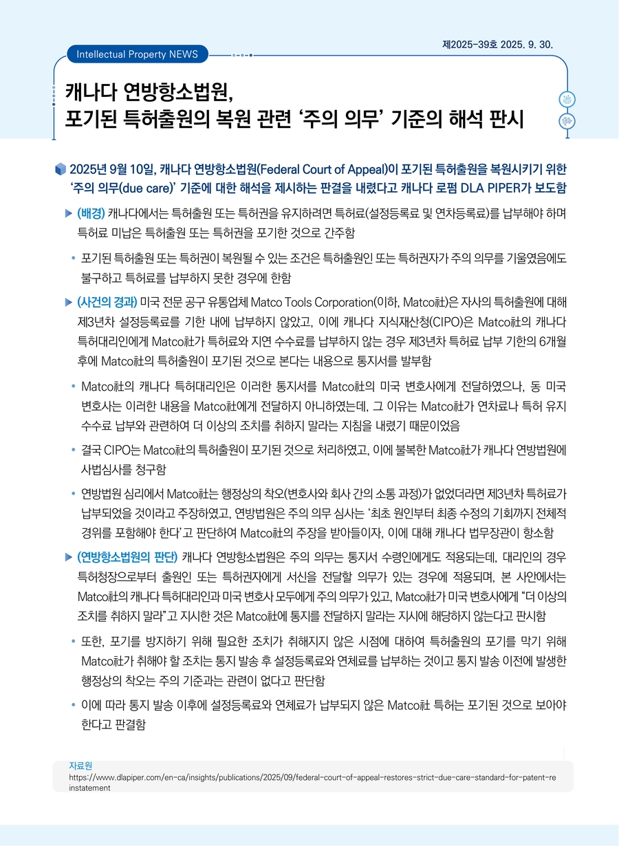 캐나다 연방항소법원, 포기된 특허출원의 복원 관련 ‘주의 의무’ 기준의 해석 판시