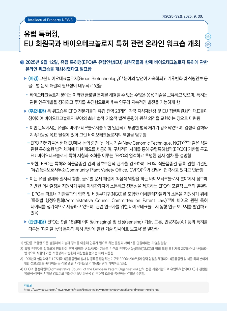 유럽 특허청, EU 회원국과 바이오테크놀로지 특허 관련 온라인 워크숍 개최